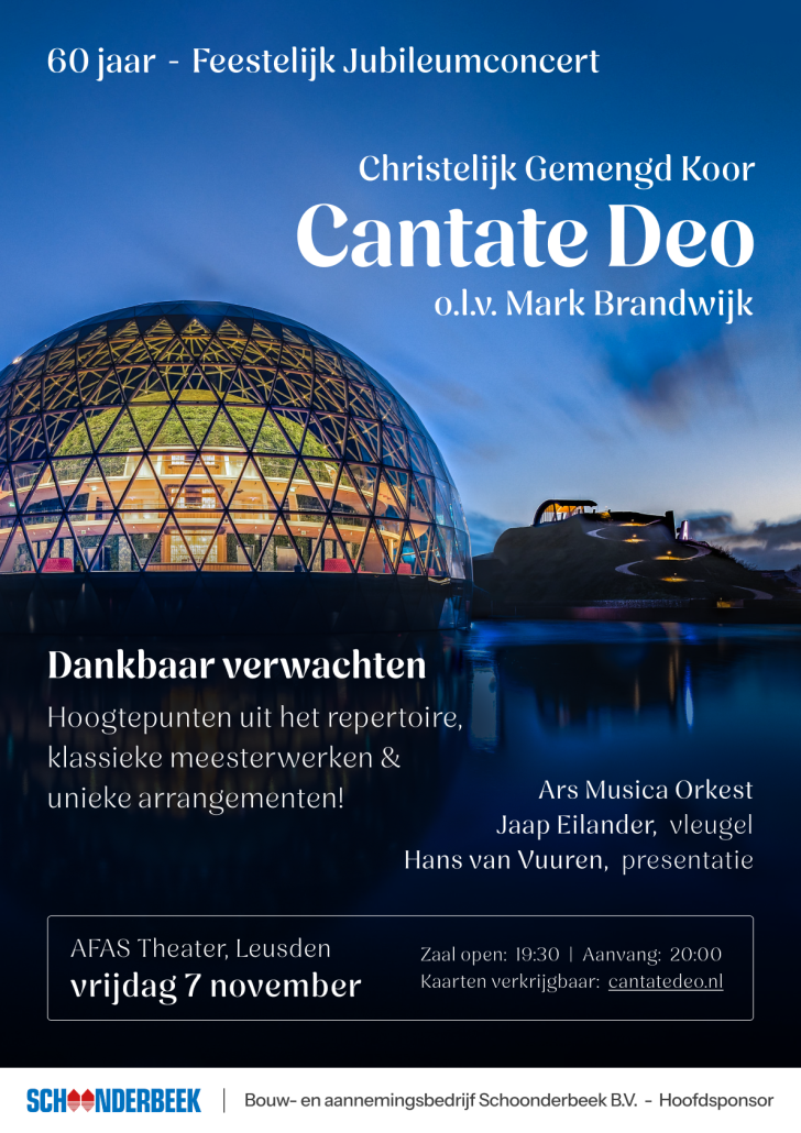 D.V. vrijdag 7 november 2025 viert Cantate Deo haar 60-jarig bestaan met een jubileumconcert. Het thema is: ‘Dankbaar verwachten’. Het programma wordt gevormd door hoogtepunten uit het repertoire, klassieke meesterwerken en unieke arrangementen. Het geheel staat uiteraard onder de inspirerende leiding van dirigent Mark Brandwijk