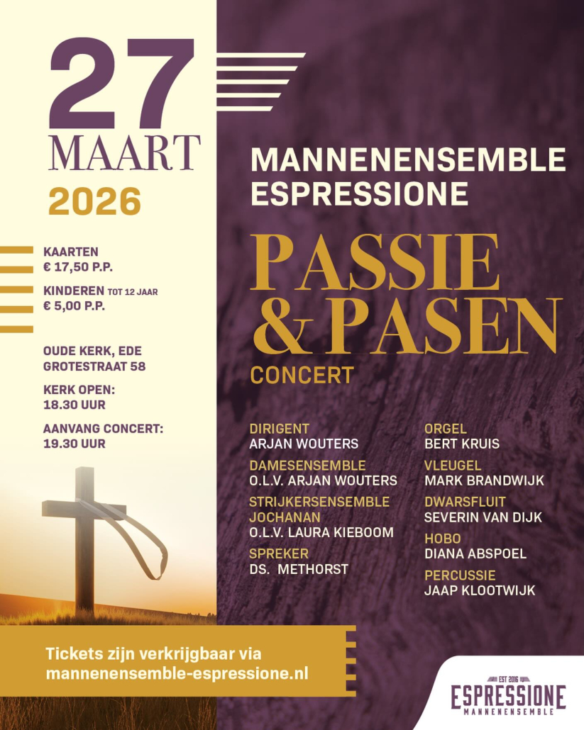 Het jaarlijks terugkerende Passie & Pasen concert van Mannenensemble Espressione met medewerking van een samengesteld damesensemble o.l.v. Arjan Wouters.
