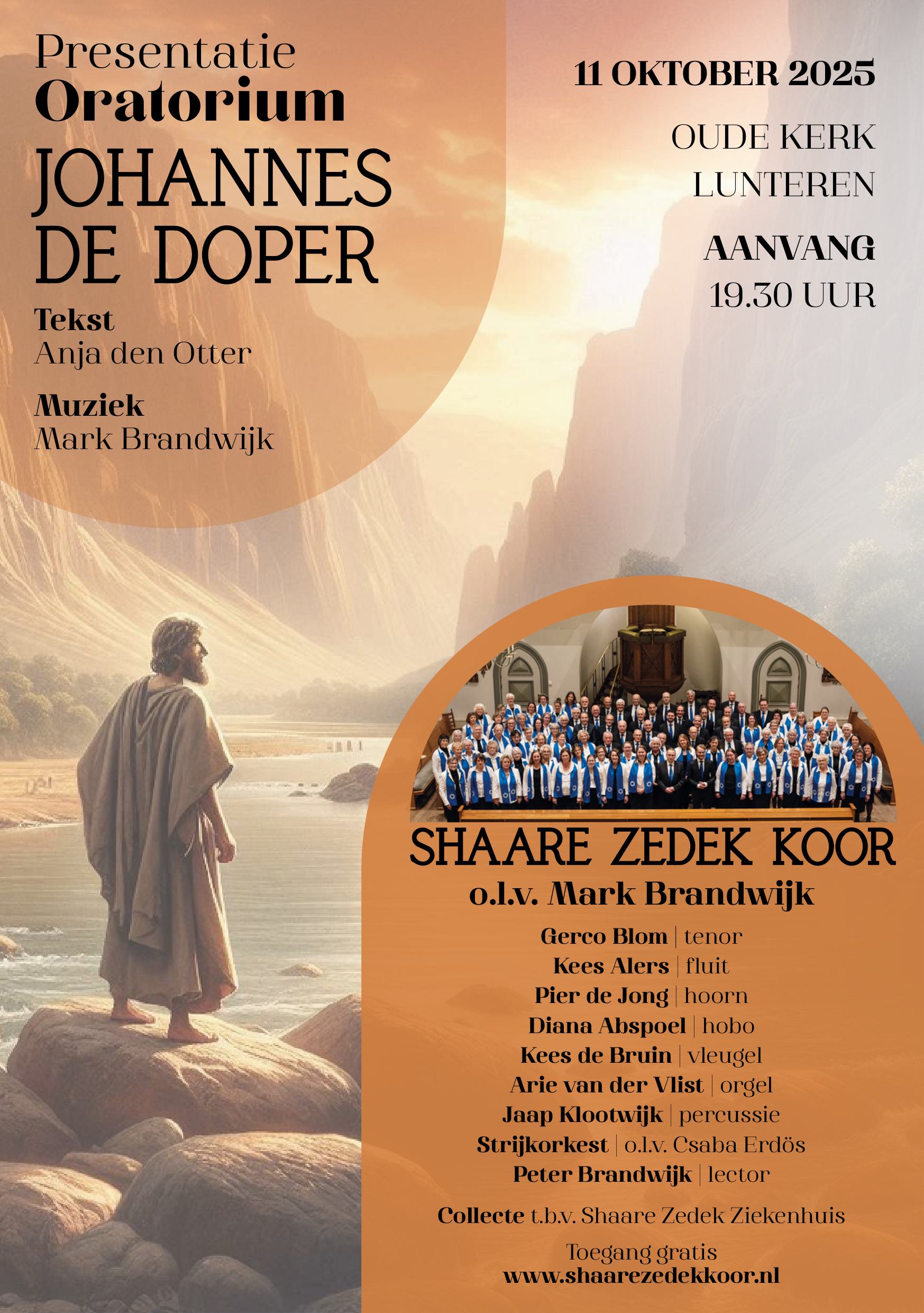 Hervormde Kerk, Lunteren Dorpsstraat 34, Lunteren, GelderlandPresentatie van het nieuwe oratorium Johannes de Doper van Mark Brandwijk, op teksten van Anja den Otter. Shaare Zedek Koor o.l.v. Mark Brandwijk Orgel: Arie van der Vlist Vleugel: Kees de Bruin Strijkersensemble o.l.v. Csaba Erdos Percussi: Jaap Klootwijk Dwarsfluit: Kees Alers Hoorn: Pier de Jong Hobo: Diana Abspoel Solist: Gerco Blom Spreekstem: Peter Brandwijk
