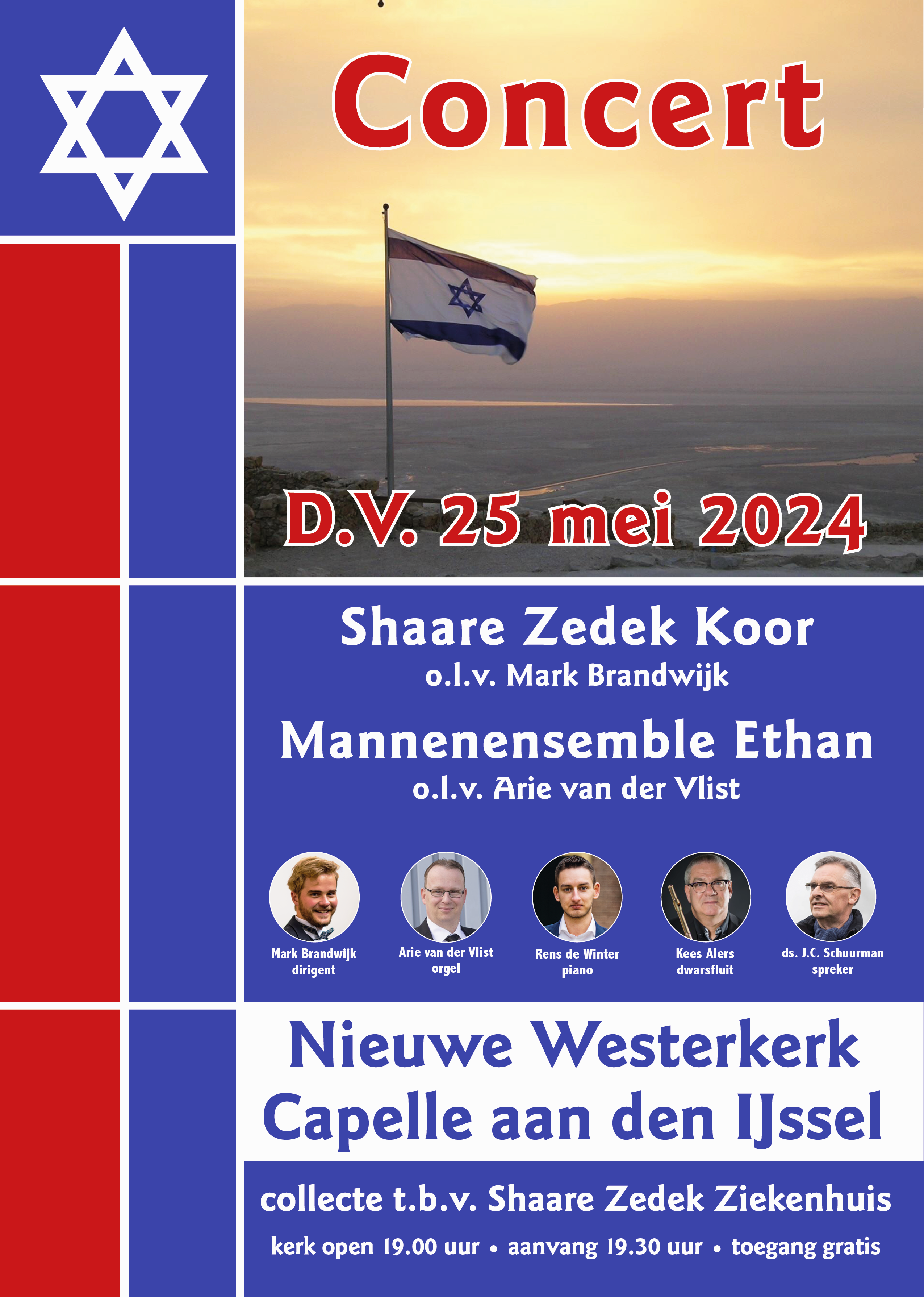 Nieuwe Westerkerk, Capelle aan den IJssel Valeriusrondeel 670, Capelle aan den IJssel, Zuid-HollandShaare Zedek Koor o.l.v. Mark Brandwijk Orgel: Arie van der Vlist Vleugel: Rens de Winter Mannenensemble Ethan o.l.v. Arie van der Vlist Dwarsfluit: Kees Alers Spreker: Ds. J.C. Schuurman Aanvang 19.30 uur
