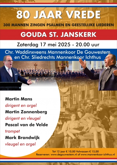 Sint Janskerk, Gouda Achter de Kerk 2, Gouda80 jaar Vrede - 300 mannen zingen psamen en geestelijke liederen Chr. Waddinxveens Mannenkoor De Gouwestem Chr. Sliedrechts Mannenkoor Ichthus Martin Mans - dirigent en orgel Martin Zonnenberg - dirigent en vleugel Pascal van de Velde - trompet Mark Brandwijk - vleugel en orgel
